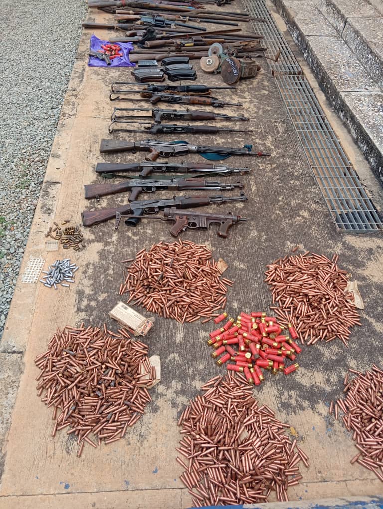 Recovered items include four AK-49 rifles, three AK-47 rifles, one G3 rifle, a submachine gun, 11 magazines, 4,046 rounds of 7.62mm ammunition, 11 rounds of 5.5mm ammunition, 132 rounds of 38mm ammunition, and 75 cartridges.