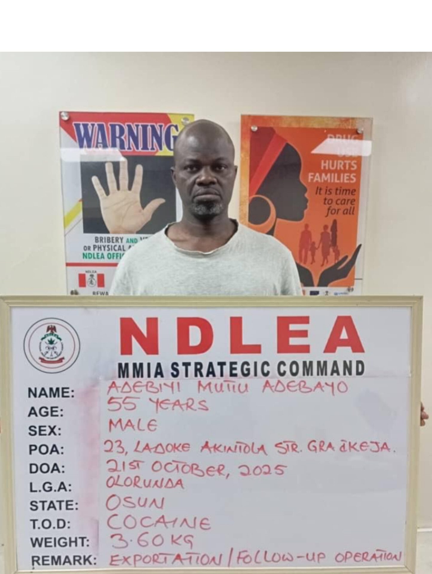 The 3.6kg shipment, presented as personal effects on an Air Peace flight, was discovered on October 14, 2025, leading to the arrest of a cargo agent, Lawal Mustapha Olakunle. Weeks of investigation later, two other key suspects—Ogunmuyide Taiwo Deborah, a healthcare worker, and Mutiu Adebayo Adebiyi, CEO of Mutiu Adebiyi & Co. Travels—were apprehended in follow-up raids.