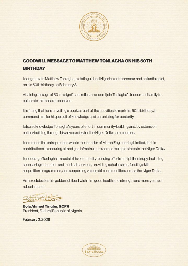 In a goodwill message dated February 2, 2026, and personally signed by President Bola Ahmed Tinubu, GCFR from the State House, Abuja, the President joined Tonlagha’s family, friends, and associates in celebrating the golden jubilee, noting that attaining the age of 50 is a significant personal and professional milestone.